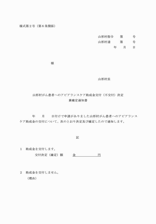第5条 助成金の交付の申請をしようとする者(その者が未成年である場合にあっては、その法定代理人)は、山形村がん患者へのアピアランスケア助成金交付申請書(実績報告書)兼請求書(様式第1号。以下「申請書」という。)に、次に掲げる書類を添付して、村長に提出しなければならない。