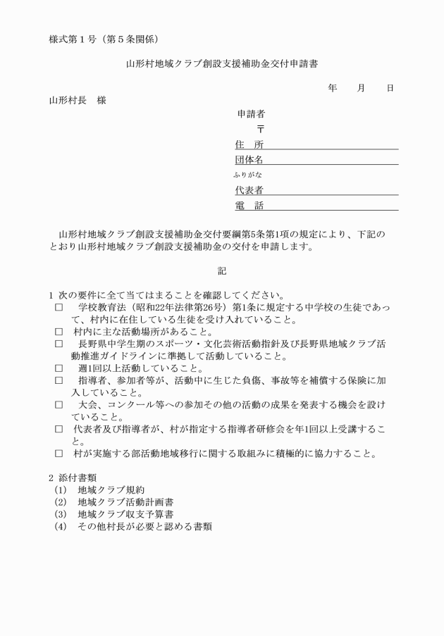 第5条 補助金の交付を受けようとする者(以下「申請者」という。)は、山形村地域クラブ創設支援補助金交付申請書(様式第1号)に、次に掲げる書類を添えて、村長に申請するものとする。